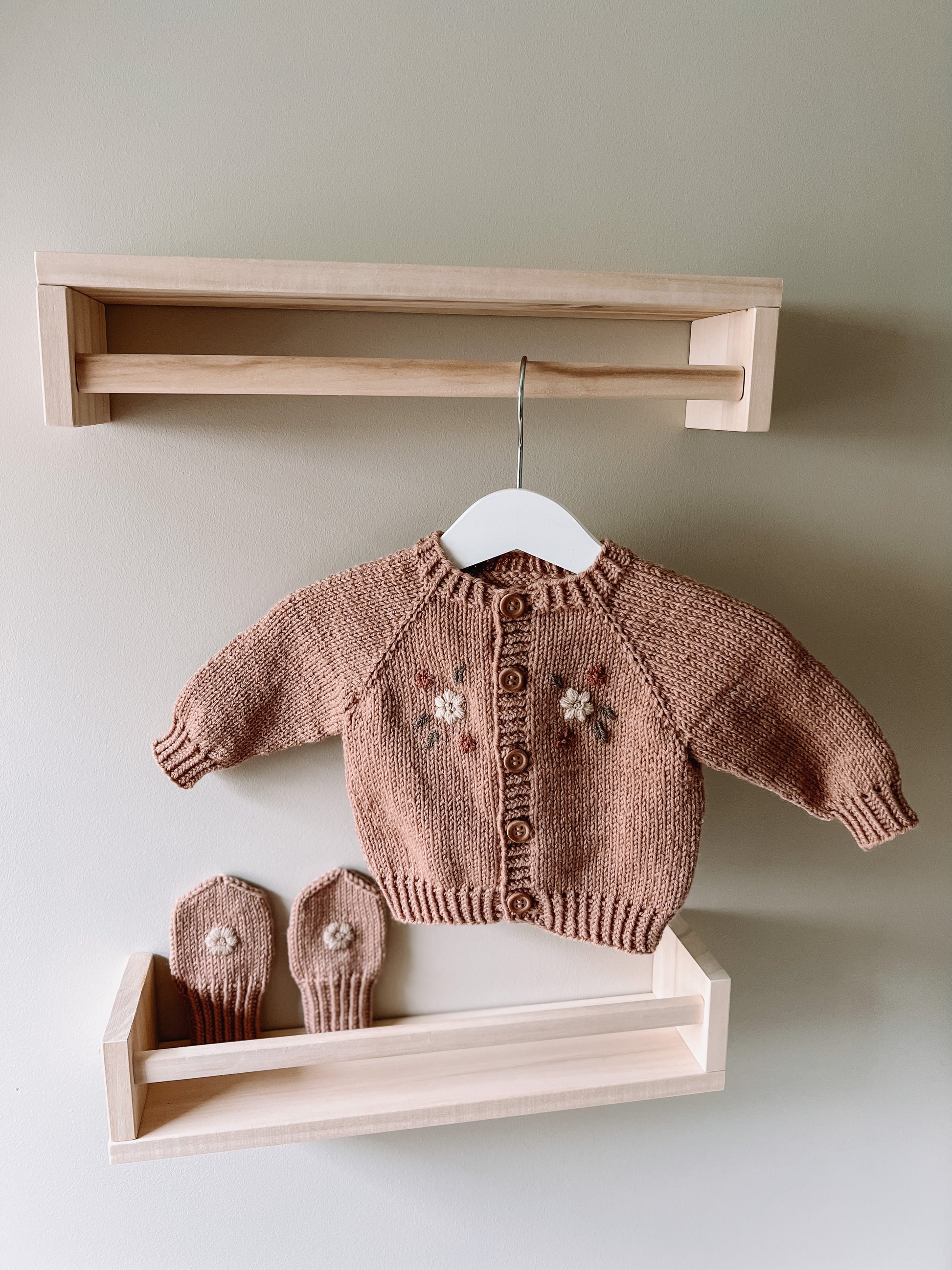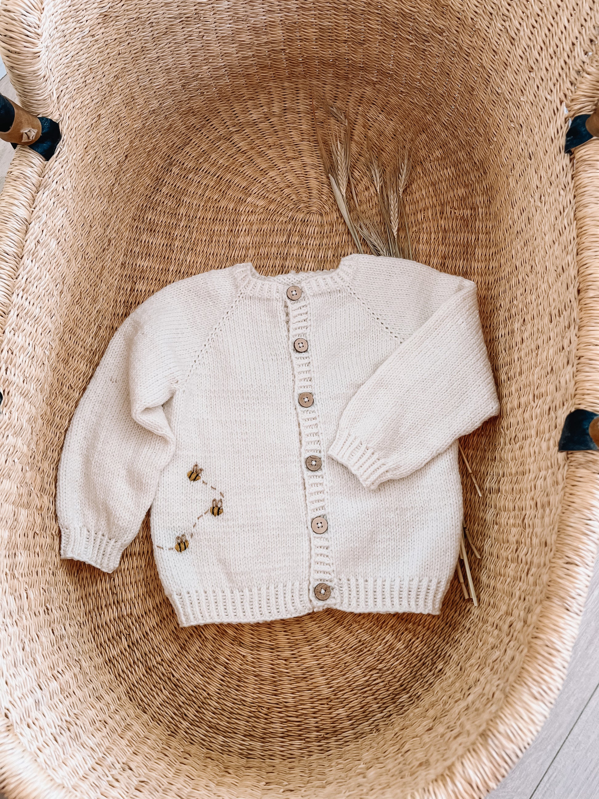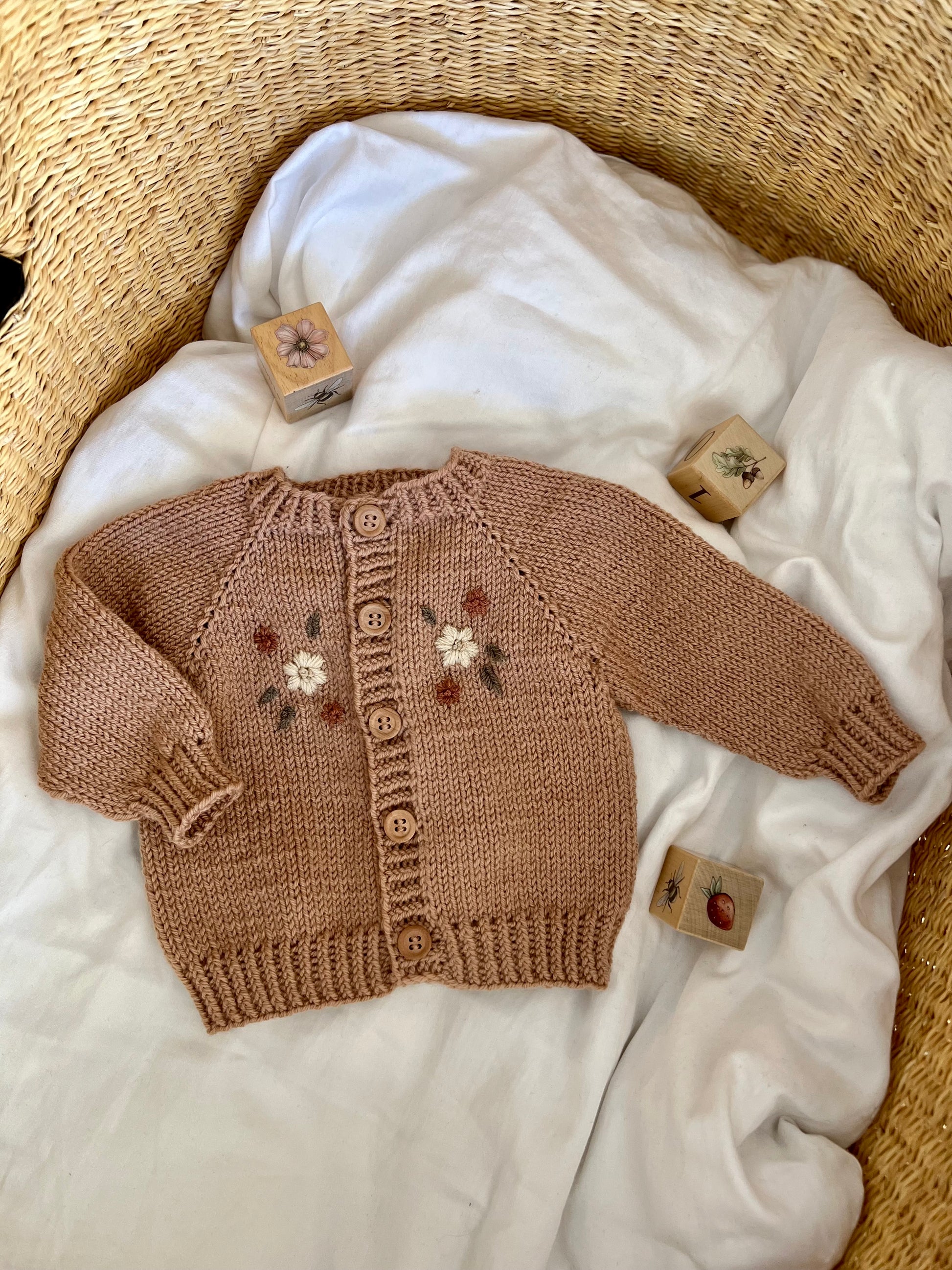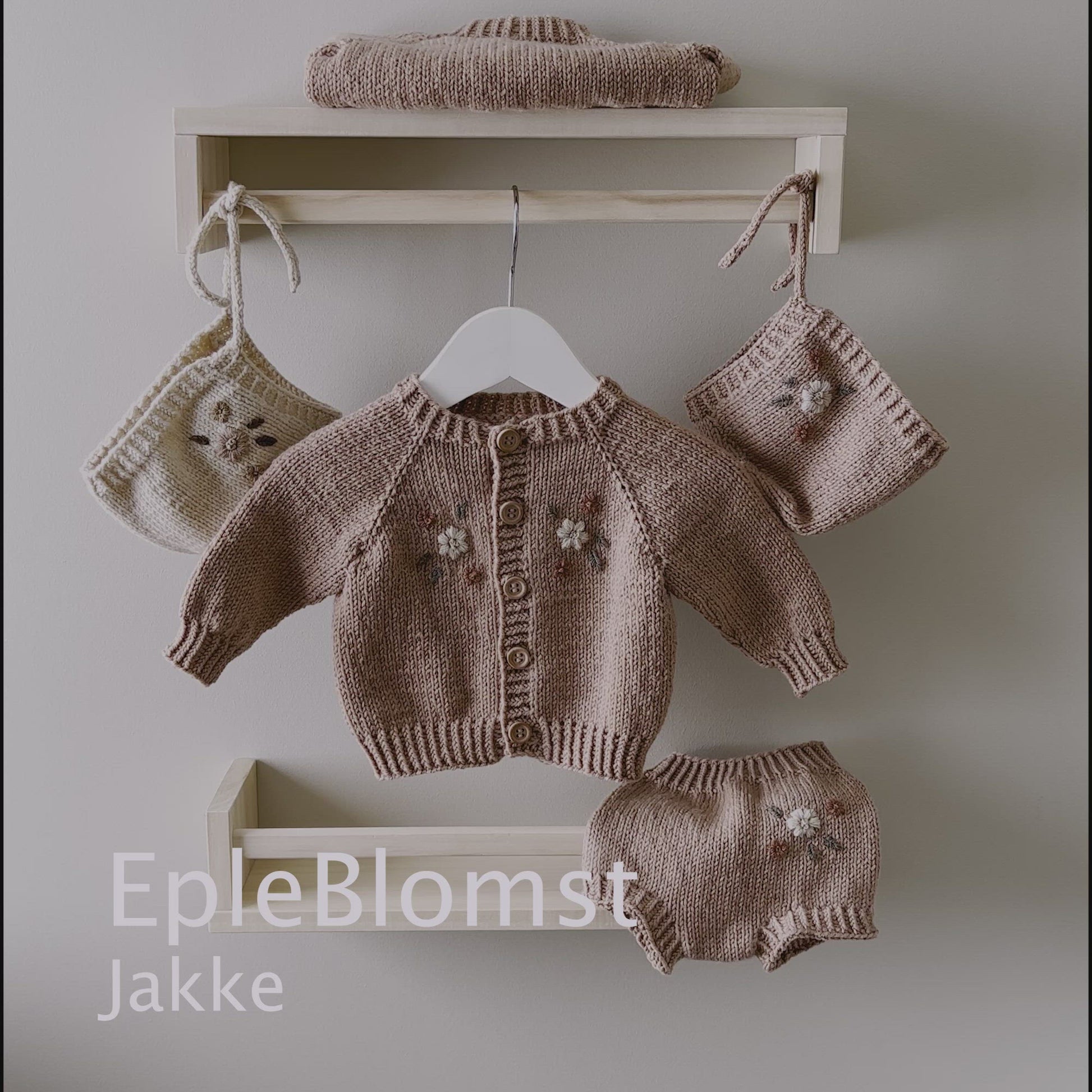 Strikkeoppskrift til EpleBlomst Jakke! Jakka strikkes fram og tilbake ovenfra og ned. EpleBlomst/Bie-broderingsmønster medfølger.