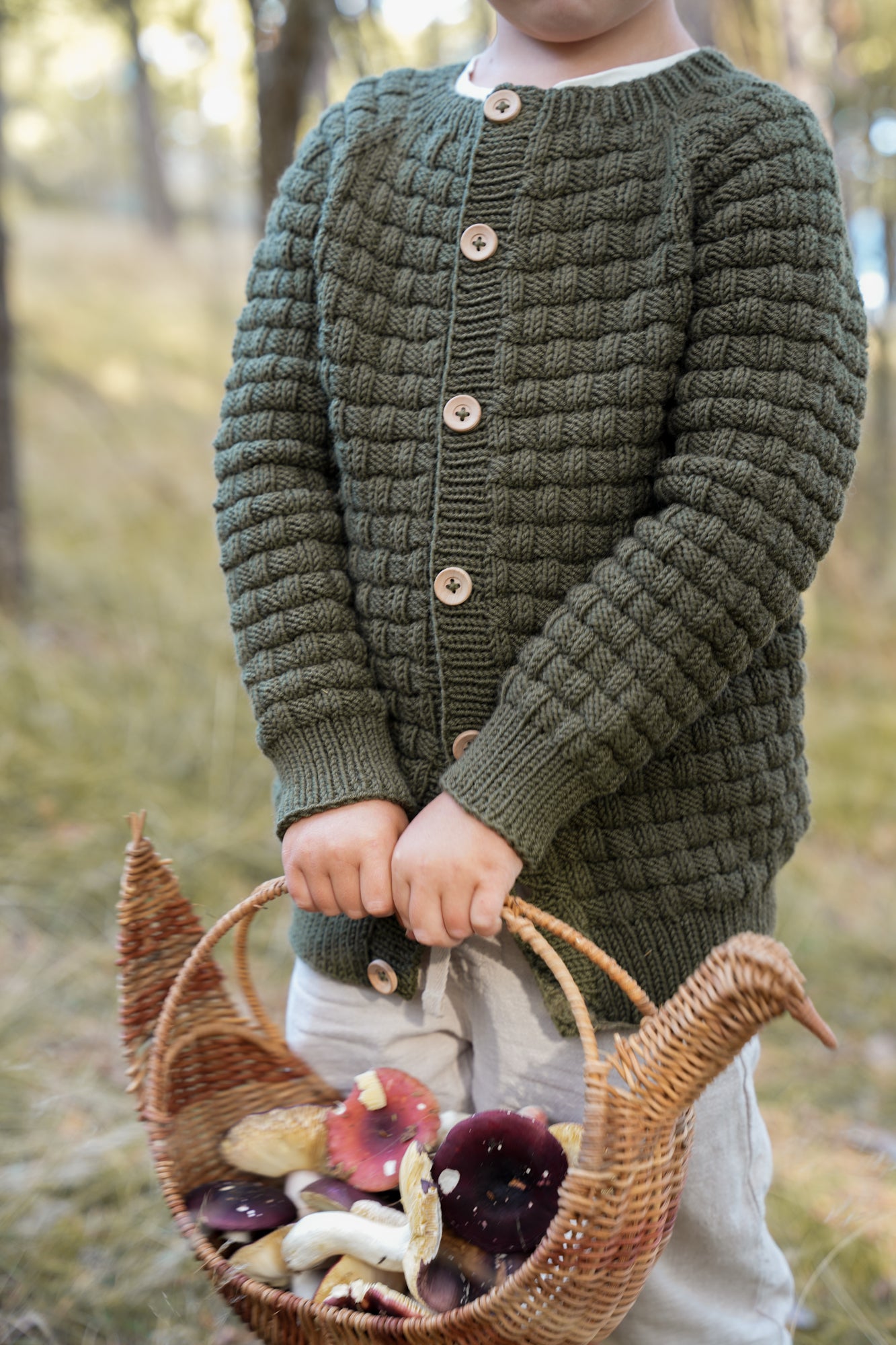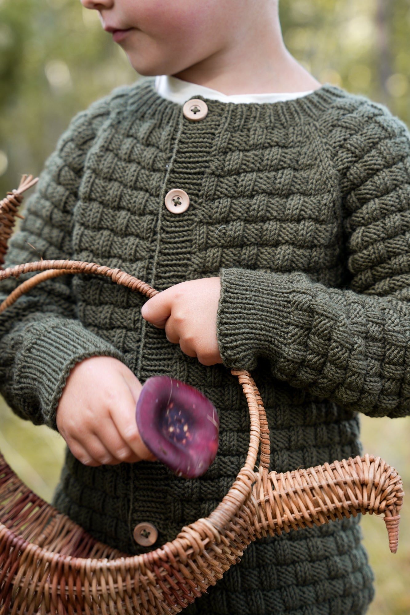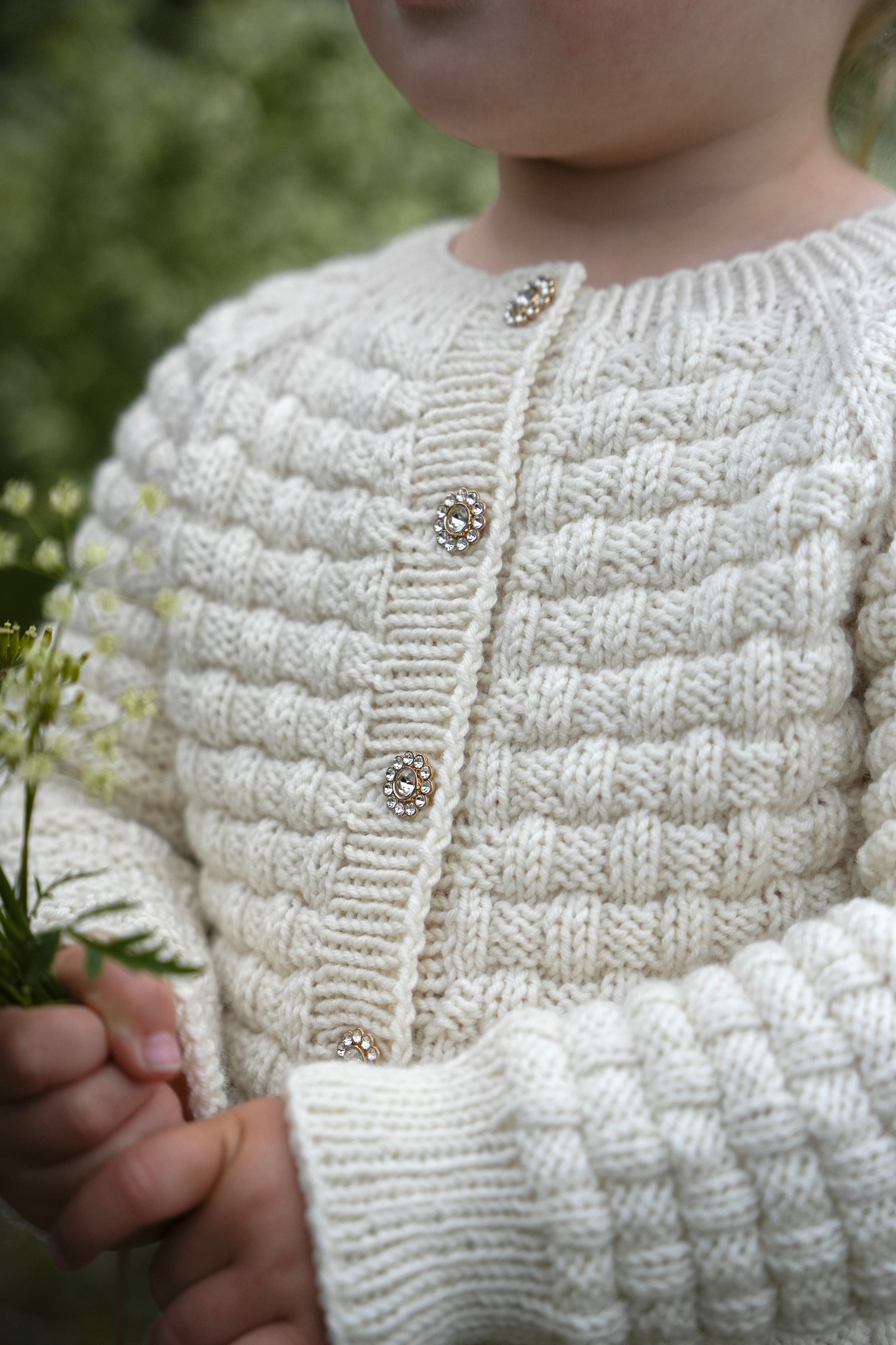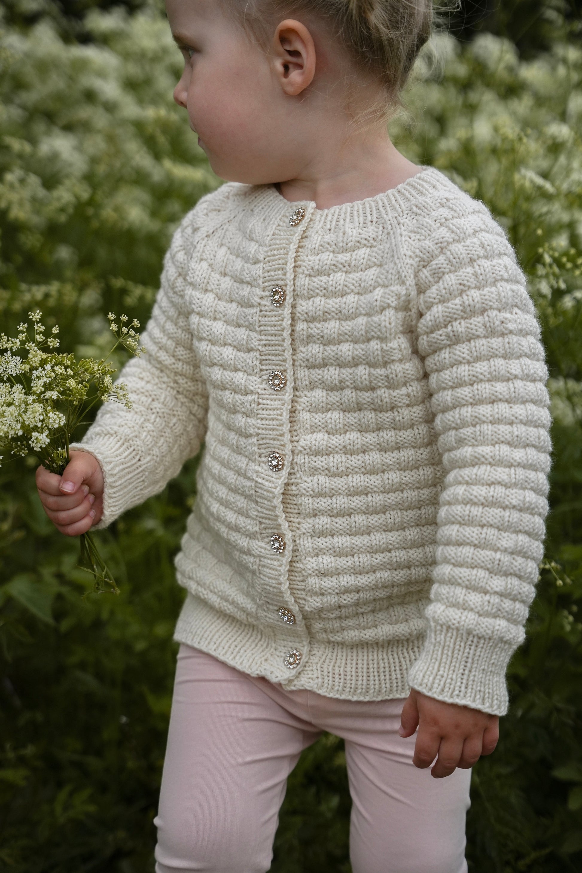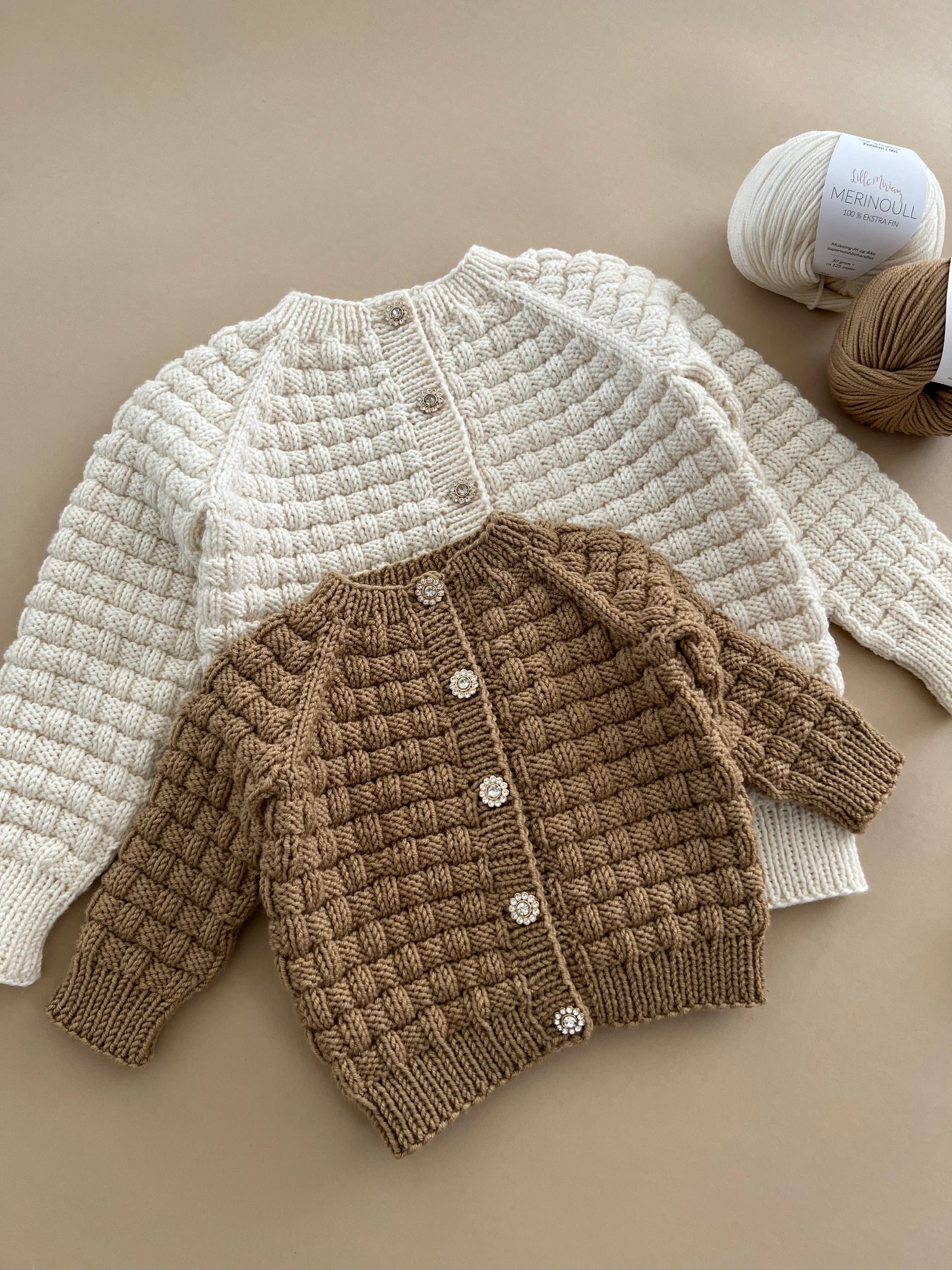 Vi har strikket våre jakker i fargene Dyp Oliven, Støvet Humle og Perlehvit.