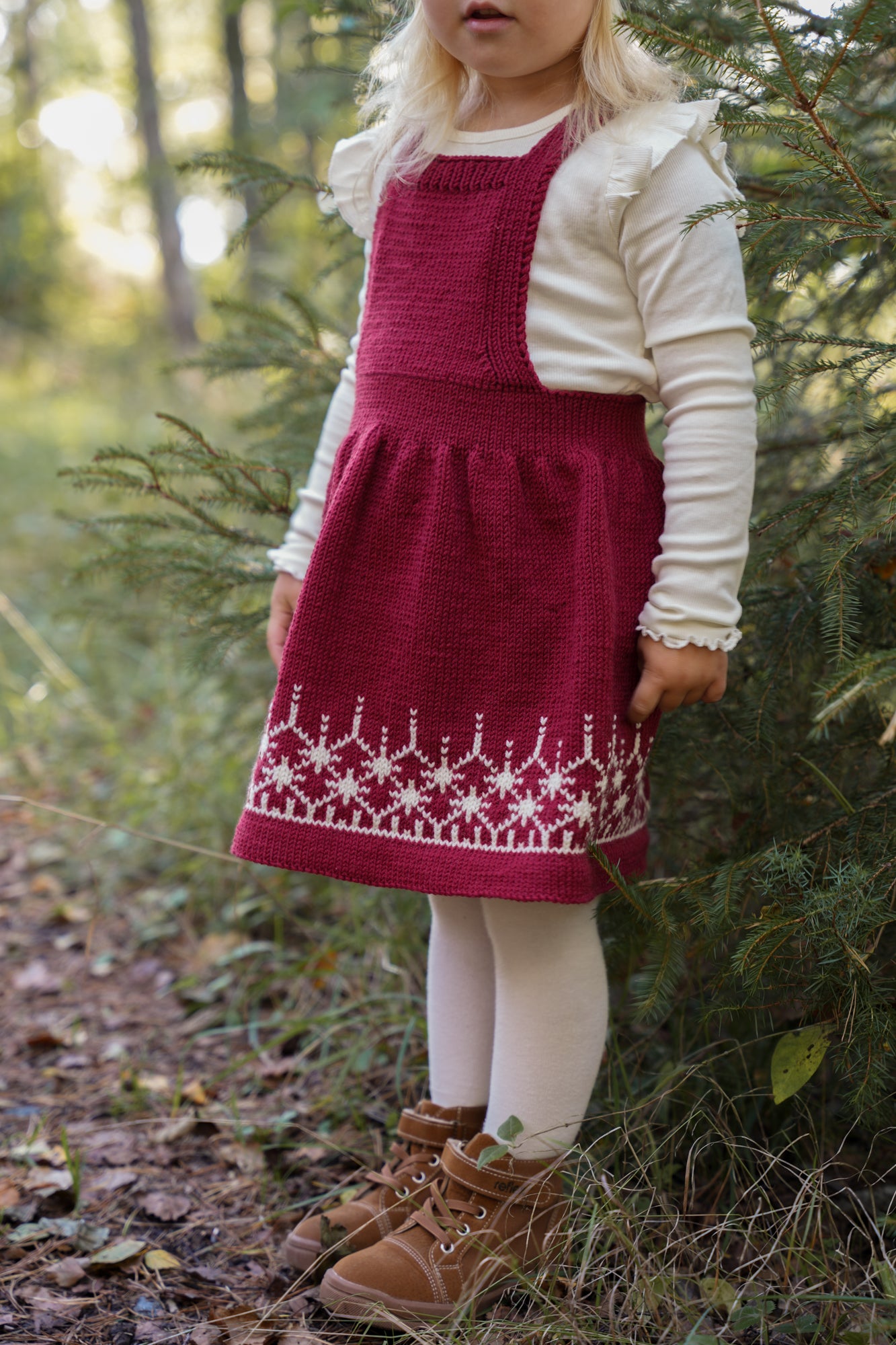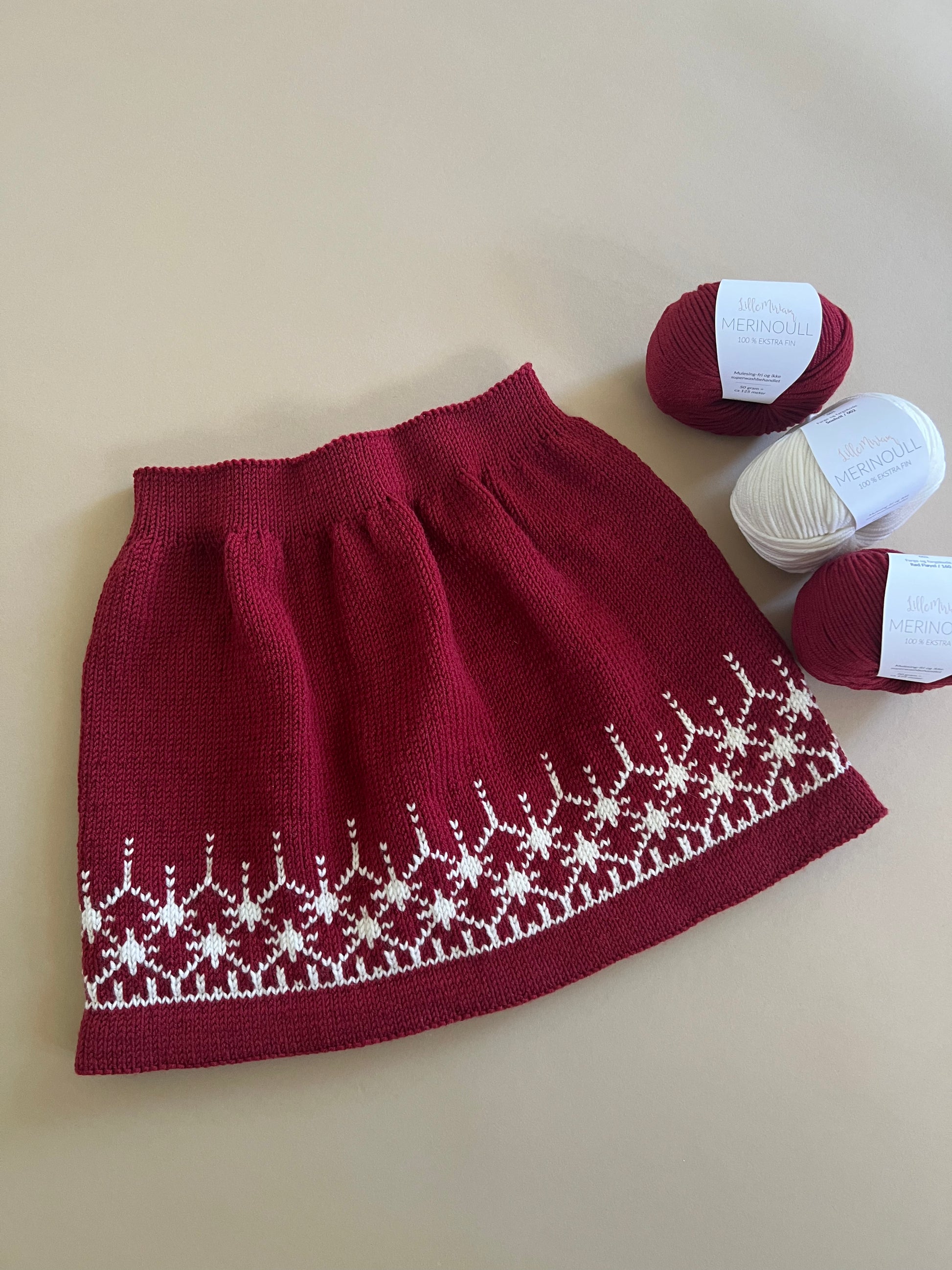 Strikkeoppskrift til StjerneFryd SeleSkjørt! SeleSkjørtet strikkes nedenfra og opp. Forstykket med seler er valgfritt og gjelder størrelser til og med 5-6 år.